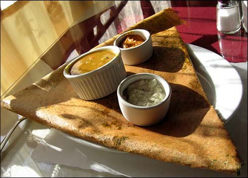 My spinach masala dosa ($8.49): ... was a equilaterally tasty. They spread this thin Indian crepe with a spinach mixture and tucked it around a nicely seasoned potato filling. The light and crispy edges feathered into the moist center of this fermented-battered pancake. A tomato-ginger and a coconut chutney came in little ramekins next to a lentil sambar. I ate every last mustard seed of this tasty lunch. The service was friendly and efficient. I’m glad I came back (after my previous, under-spiced visit) to have such a satisfying meal. I will have to return to triangulate my experience further…