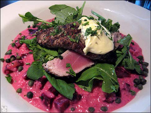 Pink is the new lunch If a cosmo were a lunch plate, this would be it - definitely not the most macho dish that I have ever ordered at the Slow Club. While my table mates ordered the always delish S.C. burgers, I got the seared tuna and beet risotto ($13.50): The fish was respectfully left in its most tasty state of rawness (after being shown a photo of some flame to seal the exterior) and served with a dollop of aioli. The girly-colored rice was creamy and punctuated with capers to keep it perky and some rocket to add a leafy-relief. Although it was all tasty, I needed more caloric reinforcement than this dish could offer. Another reason to go with the top-o-the-grail burger next time. The Slow Club