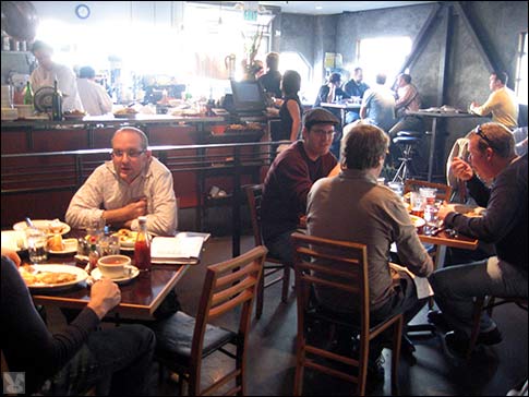 I ordered the meatloaf sandwich ($11.50): ...which took for-freaking-ever to arrive. I don’t know if it was meat and human loafing in the kitchen, but I received an unsolicited apology for the wait, “they are scampering around getting it ready.” Scampering? Maybe they should try cooking. Luckily, my internal monologue remained just that and my loaf materialized. At first I wondered why there was a limp bacon strip adorning the side of the plate, but I realized that it must have been draped over the oat filled beef loaf as it cooked. It’s fatty contribution had been completed in the kitchen and it did not succeed as a garnish. On more appetizing notes, the BBQ sauce was fine with it’s balance of sweet and tang and the levain held up well as a foundation for this open faced sandwich. I should have requested my fries extra crispy. They were a little too blonde and soft for my taste. I thought that the single slice of tomato, pickle and lettuce had a hambugerizing influence that didn’t fit (especially in those quantities.) It was fine, but sort of a half idea. The meat loaf would have been better without the bread and with a pile of mashed spuds since they already have a burger on the menu. Service has improved since my last visit when