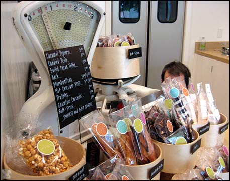 December 7, 2006 Sketchy details It was insanely congested on Berkeley’s Fourth Street today. Holiday shoppers were getting a jump on boosting the economy by snapping up goods at The Gardener and Sur la Table. Little did they know that the best stocking stuffers are tucked away across the street at Sketch. No, I am not suggesting that hosiery filled with melting crème anglaise is a pleasant Christmas greeting, but their little bags of candies are perfect for horning into Hanes. Candied popcorn, chocolate caramels and house made, choco-dipped marshmallows: ... are lined up in little packets. You really can’t go wrong. But whatever you do, do not exit this establishment without a bag of their delicate, crisp, buttery, salty, chocolaty, pecan toffee ($5.50): They spread this enriched brittle ultra-thin