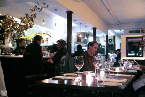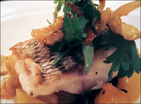... folded around a nicely seasoned duck confit topped a salad of thinly sliced persimmons, endive, walnuts and pomegranate seeds. The astringent elements cut through the richness in this texturally diverse and tasty combo. Wild striped bass ($25.00):
