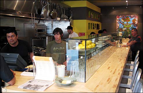 ... arrived, it looked and tasted completely different. The spice rub was pronounced on K’s pork leg, yet the one this evening was bland in comparison. The remarkably well seasoned beans and rice were replaced with tonight’s overly wet rice and under-seasoned beans. I don’t think that this is necessarily a bad sign since they are new and just getting their footing. I’m just glad that my food was so good last time that this visit could be the result of an off night. I enjoyed sitting at the counter and watching the chef make some enticing