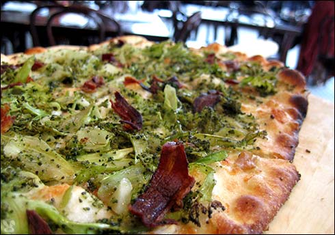 ... which was a combo of micro cabbages, chopped hard boiled eggs, sautéed onions, bacon and croutons. It was an exploded BLT with eggs. The heating of this warm salad softened the eggs, croutons and bacon to create a lack of crispy bits and made for a textural uniformity. We split a large shaved broccoli pizza: