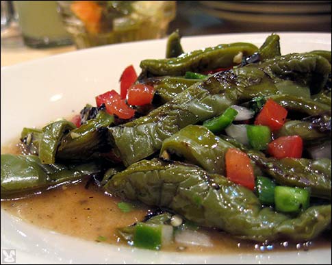 ... was a plate of declawed, grilled and sliced cactus paddles. This succulent salad had the expected strands of plant mucus trailing behind as I lifted these green ribbons to my tortilla. A vinegary salsa perked up this okra of the cactus world. I had a taste of K’s pork: