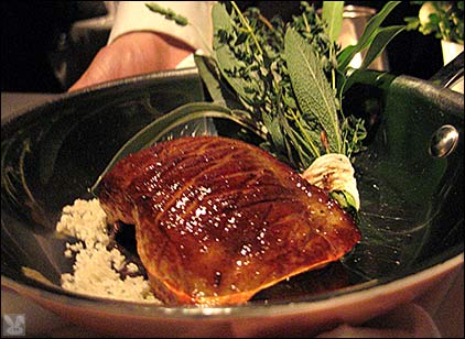 After-festival French Laundry List The Vancouver Film Festival was lots of fun, but we didn’t manage to have a nice leisurely meal during our whirlwind visit. We decided to make up for this over a five hour dinner at the French Laundry this evening. To kick things off we started with some Billecart-Salmon Rosé to wash down: Gourgers Salmon tartare cornets with crème fraiche Roasted eggplant soup over maple glazed apple Cepes soup with brioche croutons and cilantro chiffonade American Sterling caviar over whipped pistachio butter and brioche Sabayon of pearl tapioca with Beau Soleil oysters and American Sterling caviar Santa Barbara uni over a green apple granita monkfish liver encased in a red radish gelee 2005 Franz Hirtzberger, Gruner Veltliner “rotes tor” Coddled hen’s egg with black truffle brunoise and brioche soldiers White truffle custard with chive chip Sweet 100 tomatoes with Swiss chard ribs and nicoise olive sauce Hearts of palm three ways (batons, hearts and chopped) with avocado, beets and beet jus 2004 Domaine William Fevre Chablis “Fourchaume” 1er cru, Burgundy Tagliatelle with Burgundy truffle Chestnut and mascarpone agnolotti with celery branch and Burgundy truffle Brined, olive oil poached, Columbia river sturgeon with cabbage and capers Diver’s scallop with applewood smoked bacon, corn, beans and peppers Butter poached lobster with cipollini onions, sunchoke puree and a port, coffee and chocolate sauce 2003 Skewis Floodgate vineyard Pinot Noir Whole roasted foie gras (yow!) with Siverado strawberries and Belgian endive: Veal and sweetbreads with roasted chanterelles, red curry squash and a veal reduction with brown butter and sage Mrs. Quicke’s cheddar and broccoli gratin with additional Mrs. Q’s shaved over the top Bleu d’Auvergne with pain perdu and spicy peanut sauce with shaved grapes Plum sorbet over pistachio nougatine with meringue and a balsamic reduction Passion fruit sorbet on top of a passion fruit granite with passion fruit seeds Hot donuts rolled in cinnamon sugar with a cappuccino semi-freddo Mint chocolate delices – white and dark chocolate layers with praline, mint and ganache with ice cream between chocolate tiles Dark chocolate ganache over caramel with hazelnut praline with gold leaf Tahitian vanilla crème brulee Layered chocolate pots du crème and cake palmiers chocolate coated macadamias white fudge with dried cherries pistachio chocolates assorted truffles espresso packages of shortbread for the road (in case we got hungry) There’s a good reason that the French Laundry got those three Michelin stars. They deliver the goods and never rest on their laurels. The menu continues to evolve as they push themselves (as well as their purveyors) to produce the best product they can. Their shift from Russian caviar to American Sterling is an example of how they seek untainted goods that are made to a high standard (hold the borax.)