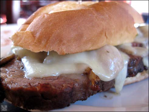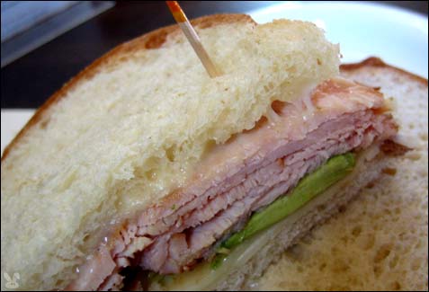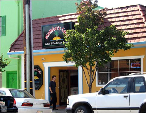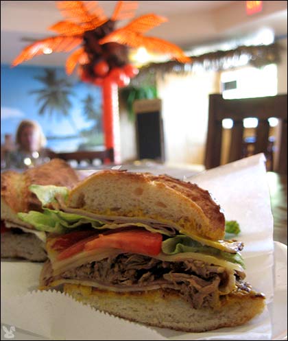 After yesterday’s sandwich trauma, I felt compelled to shake it off with a meat and cheese sandwich hold the powdered sugar and raspberry jam. I went to Mambo’s Café: ... and asked if they served Cuban sandwiches ($8.25): They said they did, but they haven’t got around to listing them on the menu. A big toasty roll held a combination of pork, turkey and ham with melty Swiss cheese tomato slices and iceberg lettuce. Yellow mustard and mayo lined the toasted bread of this generous, meaty lunch. It was good, but not trip-worthy. I will have to order off the menu next time to check out their Cuban and Puerto Rican chow. There are faux palm trees with flashing lights and a giant rooster sculpture in the middle of the dining room. I even spotted a restaurant critic at a nearby table so I guess we’ll be hearing more about this place soon. Mambo Café