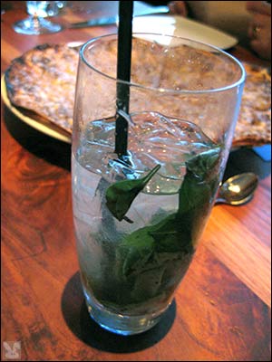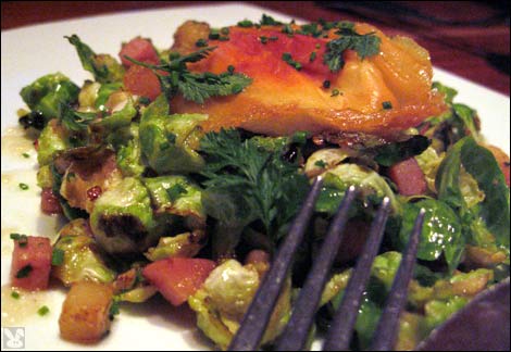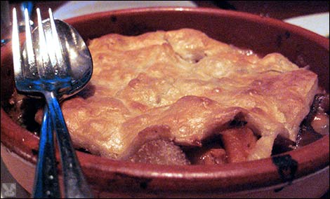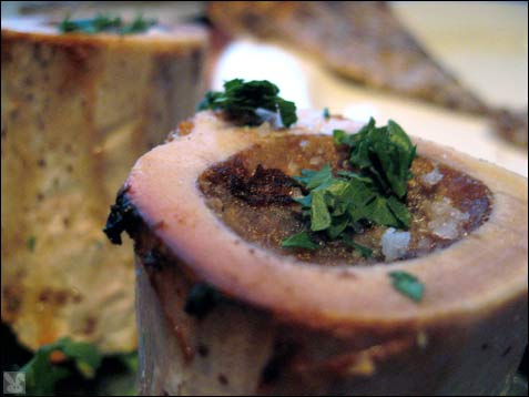 ...with Hangar One Lime Vodka and Thai basil. We perused the menu as we munched on one of their flatbreads ($9.00): ...with parmesan and fragrant truffle oil. We performed our own bone marrow transplants ($8.00): ... from our plates to our stomachs. These delivered a skele-ton of flavor with a simple roasting and shower of sea salt and parsley. Baguette croutons delivered a contrasting crunch to this rich bone butter. Brussels sprout leaves ($13.00): ... were served in a warm salad of pine nuts, ham and goat cheese. This rich and fresh pile of greenery made for tasty and virtuous eating. Duck pot pie ($18.00): ... was a generous serving of puff pastry crowned, kabocha squash, root veg and succulent quacker. We all liked this just fine. We also devoured some savory, red