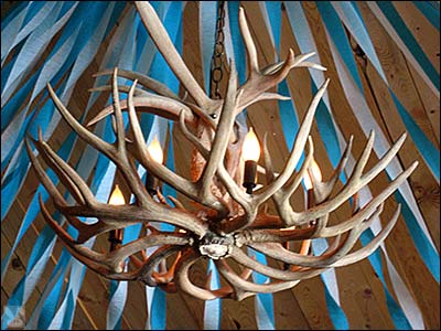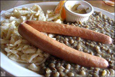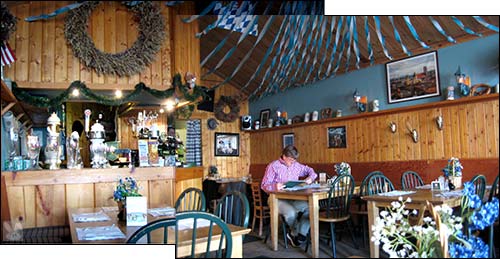 The thinly pounded pork cutlet was breaded and fried to a greaseless, golden, crispness that concealed the moist sheet o’ meat within. The red pickled cabbage had a strong vinegar punch that was the perfect contrast to this Frisbee sized carnivore crisp. The roasted potatoes were well seasoned but relinquished their crispy bit duties to the schnitzel. Boiled carrots were dull but boring, even for a bunrab. Entrées come with a choice of soup or salad. We got one of each. The salad is a standard issue iceberg with slice of tomato. The soup: ... is a potato which was fine, but nothing spud-tacular. Chubby got the Knackwurste ($11.75): ... which had a good snap, but relied on the pot of mustard to fulfill its flavor delivery requirements. The lentils were slightly overcooked but he still liked them. The accompanying spatzle were on the bland side but still good in their noodley support of the other elements of this dish. BTW, who named this tube steak anyway? It is runner up for wurst food name ever (first prize still goes to fal-awful.) I like the funky décor of antlers: ... petrified pretzels and steins augmented by crepe paper: ... that looks like the German equivalent of the year long Christmas lights in Chinese restaurants. The atmosphere is welcoming and it is a good place to go if you sprechen zie Deutch.