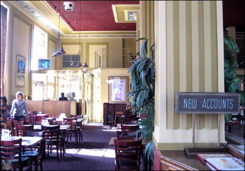 ... were what you would expect at a bar anchored eatery. These alcohol offseting protein and fat sticks had a crunchy exterior and slight pepper kick. Nothing that set off any alarms, but I AT-'M. ... had that same non-compounding quality. This turkey and avocado sandwich did not deliver the melt in it's name with the stiff slices of Jack cheese over slices of sourdough bread. Chubby went with the prime rib sandwich ($11.95): ... which was on the specials board. This could be FDIC insured with its tasty slice of beef, melted Swiss cheese, sauteed mushrooms and soft torpedo roll au jus. It isn't worth an investment of travel, but if you were checking out the town, you might bounce over for this protein portfolio. This sparsely decorated conversion: ...feels incomplete and the headsets worn by the wait staff make them look like loopy bouncers and they are summoned back to the kitchen as they stride towards a faked out table. The Vault Restaurant