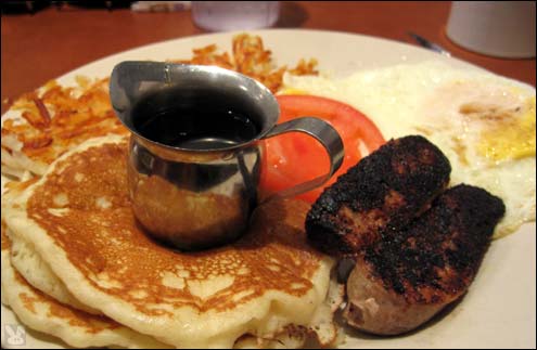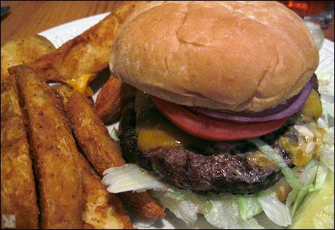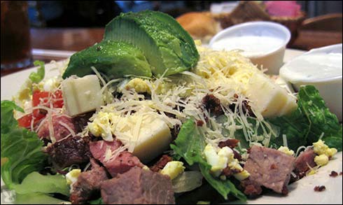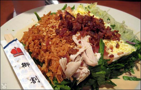 the road. ... are a little more fussy than I prefer, even if they are only some carbo snacks and coffee. Does anyone really butter and jam their chocolate croissant? Seems like it’s gilding the lily to me. After hitting the midpoint of our journey, we pulled off the highway at the Harris Ranch Restaurant: We went in with low expectations and they were fulfilled. We were told there would be a 10-15 minute wait (like they do at House of Prime Rib when there are tons of tables, but they want you to buy cocktails first.) We were then assigned one of those gigantic, flashing and talking pagers that naggingly summon you to the dining room after your gift shopping time has elapsed. A female voice emanates from the pager repeating “..your table is ready, please return to the dining room..” over and over. Not a pleasant welcome. My beef cobb salad ($11.95): ... was a soulless combo of chopped hard boiled egg, bacon bits, tomato, lettuce, big cubes of deflavorized jack cheese, chunks of cow and avocado. Chubby got a Ranch Burger ($9.95): ... which had a 1/3 pound Angus patty. The soft bun was quickly juice-logged by this average burger. The wedge-cut fries, cooked extra crispy, provided a solitary high note to lunch. They were crunchy on the outside, creamy on the inside and well-seasoned. Judging by a quick scan of the clientele, it appears that this place is big with the seniors and prison guards. I guess we don’t fall into their target audience. Next time we’re going to stick to In N Out burgers… Harris Ranch