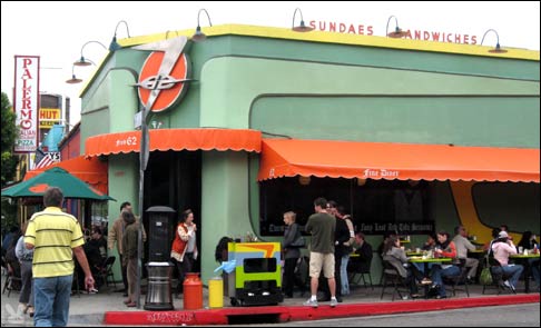 Fred 62 used to be a regular weekend stop for us when we lived in Los Angeles. A few things have changed since our last visit, gone are the pop-up toasters that adorned each table (hmmm did the firemarshall or their insurance agent make them toast?) Their casual, fun vibe has remained in tact. The people who work here are friendly and efficient. I got a dime bag ($10.00): I chose chicken sausage which didn't err on the side of appley sweet. My overeasy eggs were just as advertized, and the two little flapjacks and hashbrowns delivered the soft and crunch of their respective starch responsibilites. A solid breakfast. Chubby got the Thai Cobb salad ($9.52): ... he liked the shredded spinach, green papaya, sieved egg, bacon bits, tomato and crunchy wonton stack, but he thought it was slightly overdressed with a creamy pool that was reminiscent of the mayonaise and ketchup dressing he used to make for his wedges of iceberg lettuce as a kid. The chicken breast was a bit dry, but this was pepped up after a stir in the pink moat surrounding this, for the most part, tasty salad. Fred 62