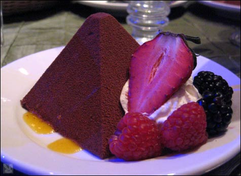 ... with mac and cheese, beans and carrots. A chocolate mousse pyramid: