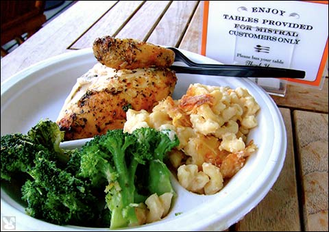 ... which comes with a choice of two sides. The broccoli and the mac and cheese were both good. I particularly enjoyed the crispy, cheesy bits on the surface of my macaroni. The one thing that I would have done differently would have been to request dark meat. My light meat was a little dry although the flavorful seasoning rub helped to distract me from this deficit. I guess this just means I should spin my hind quarters back here for more hind quarters.