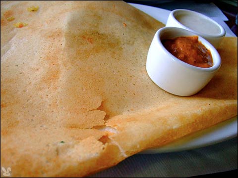 ... which were served with a pot of chickpea and onion curry. They were all good but verging on undercooked. These vegetarian rounds all contained different fillings including green beans, tomato, peas and cheese. Fine, but not on our list of dishes to reorder. I got the onion spring dosa ($8.49):