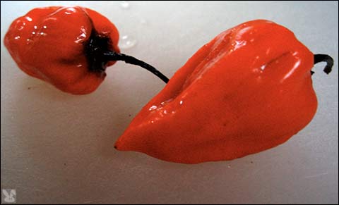 With gloved hands, de-seed, de-vein and roughly chop the habanero peppers: