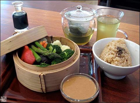 The name made me think of Café Gratitude (but they didn’t have any board game or cult to go with this preparation.) A steamer basket filled with vegetables came with peanut sauce and “germinated” brown rice. The healthy assortment of vegetables included broccoli, cauliflower, bok choy, and shitake mushrooms. Asparagus was a little overcooked while the turnips and peppers were very raw. The peanut sauce was needed to remind me that I actually had some functional tastebuds. I think that I was experiencing a moment of confusion when I ordered my “clarity.” I should know better than to select something that sounds so healthful. It’s my own fault that I ended up with a clunker. Next time, I’ll order something less wholesome without such a zenned-out name.
