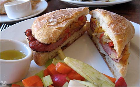 Slices of zucchini, eggplant, bell peppers and radicchio were dressed with olive oil and balsamico. This dish was simple and to the point. The grilled Italian sausage panino ($9.00):