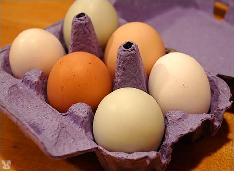 Fat free half and half? WTF? (abbr. for where’s the fat?) I guess the question is half what and half what? Has everyone gotten so fatphobic that we really want to enhance our beverages with chemical effluent? WTF? Thank goodness for real barnyard products. A. came over with what she knows are our favorite things – eggs from her Araucana chickens: