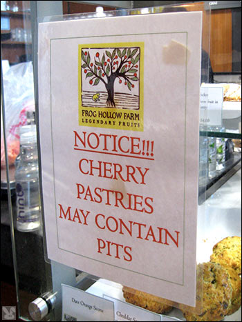 We had been stoned by them in the past and know to pro-seed with care, but it's good to see this kernel of truth on display for the un-pip-pared. As we perused the fruity offerings, we were told that the crostadas ($4.50): ... were still warm from the oven. These peach and cherry hot pockets were surprisingly, pit-free with sweet and nicely acidic fuzz fruit and halved cherries encased in rough puff pastry: We have found that their smaller tartlets tend to tip too heavily on the doughy side for our tastes, but this hand held pie filled with their froggy fruit was just peachy by us.