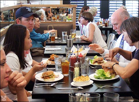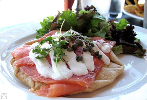 A few things have changed since our last rotations. They added dinner service and menu items including a kobe burger ($15.00): This heiferty half pound of cow was topped with grilled onions, Morbier cheese, tomato and lettuce and shoehorned into ciabatta. A haystack of fries came with a pot of aioli for spud snacking between bites of this flavorful, beefy bun. The smoked salmon tarte flambee ($9.00): ... was on the opposite end of the dining spectrum from the burger – it was more of a "ladies lunch." A crisp, thin crust was topped with fish, crisscrossed with crème fraiche and dotted with capery punctuation. This Alsatian sensation quickly made a migration due to its limited ration. This casual, dockside eatery doesn’t have umbrellas for their outdoor seating, but the indoor area opens out to the deck via their big, roll-up garage door. One nice feature of this waterside bistro is that it isn't overrun by tourists who seem to race to the main drag.