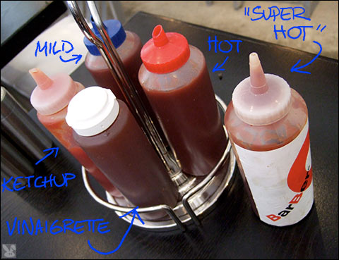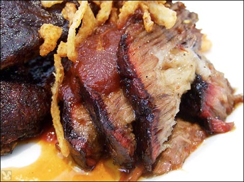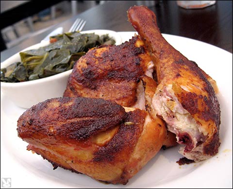 We decided to make a bbq pit stop on our way to The Fatted Calf as a warm up for tomorrow's grill activities. BarBersQ is located in a mall: ... that wouldn't draw your attention except for that meaty aroma wafting from their business. Chubby got a combo ($18.95) of baby back ribs: ... and beef brisket: This plate of smoky, tender meat had a heap of crunchy, lightly dressed coleslaw and some crispy onion bits. We asked about the selection of sauces and were told that it included hot and mild bbq sauce, a pepper vinaigrette and ketchup. We asked if the hot lived up to its name and were told that they had an super hot version that was available by request only – of course you know what we had to do. After sampling all of the reddening agents, we determined that the extra hot sauce was our favorite, it had a nice vinegar and pepper balance but strangely, none of these liquids were high on the Scoville scale. The special sauce was pleasing but induced no smoky discharge from our ears. Once the ribs and brisket were given a drink of this pepper potion, they realized their meaty potential. The half Fulton Valley Farm chicken ($15.95): ... also benefited from the hot stuff. This tender, flavorful bird was cooked to a juicy doneness with crispy bits of skin and served alongside some bacon infused collard greens. This smoke station is not for those expecting an ice cream scoop of church bazaar potato salad and some Kilpatrick's bread, it's barbeque with a dining slant and lots of room for argument for those purists.