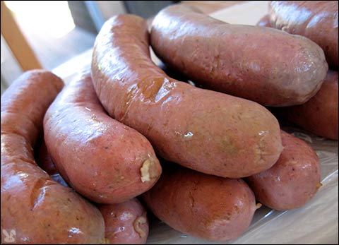 Perhaps Americans contribute to their sad state by devouring the other kind of dog in record quantities compounded by the media madness surrounding this frank frenzy. We mourned Kobayashi's wurst performance (which knocked him out of the running for first place in Nathan's annual eating competition) by having tube steaks in his honor. The Fatted Calf makes their knockwurst: ... from Marin Sun Farm's cows and pigs. If you want to change the first name of your sandwich meat to something a little less industrial, you should check out this haute dog . This fully cooked meat mass is a wiener winner (as is Joey "Jaws" Chestnut the new dog chomping champ.)
