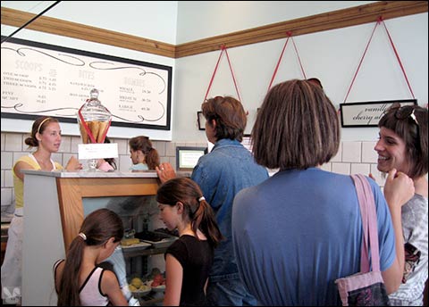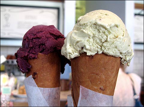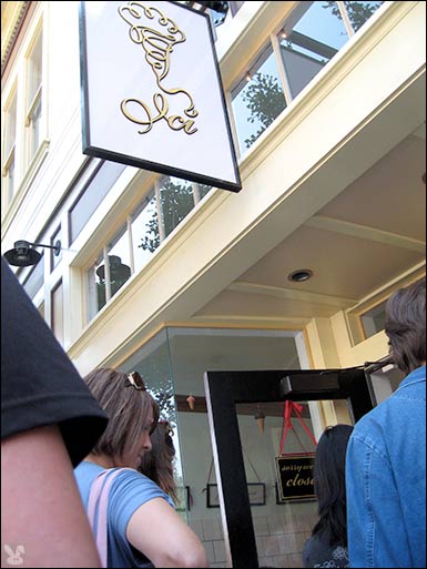 Our appreciation of Ici's conical confections did not command a cashflow to calorie comparison to convince us of their creamy, cooling consequence. We both got their housemade cones ($3.25 each): ... which they hand roll and plug with a small shot of chocolate grout to prevent drips and reinforce their addictive quality. Chubby filled his with blueberry sherbet while I went with the candied pistachio ice cream. While the purple blob was a refreshing, fruity cooler, I was nutty for my pale green, enviable edible. Crunchy, sugar-crusted meats greeted my every bite of this rich kernel concoction. Our selections today were much more successful than our last visit. The 'scream line was streamlined: ... as orders were taken by a couple of scooping associates from those further back in the queue. The chilly reward made up for the crowd as well as the psychological torture witnessed during our wait.