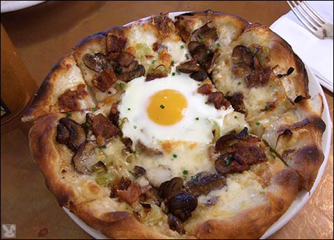 ... had a nice crunchy and chewy crust lined with sautéed leeks, sliced mushrooms, mozzarella and asiago. Alchemizing bits of bacon rounded out this flavorful flatbread. The egg looked great, but it was cooked until the yolk was firm so it refused to act as a saucing agent, but this wasn't enough to eggstract our zeal for this 'za. Mexican scrambled eggs ($8.00):