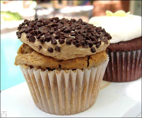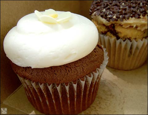 This chain stems from their Emeryville shop, but sadly, the Marin outlet dispensed with the Mr. Espresso coffee (which they dispense at their flagship.) This meant that I was disposed to be addressed as "your flagship" since I didn't have the necessary caffeine counterpoint (the nearby Tully and Il Forniao coffee isn't my thing.) We got a Chocolate Sour Cream Cupcake ($3.00) with a vanilla frosting: