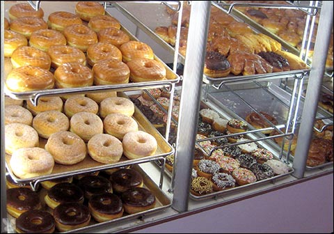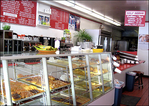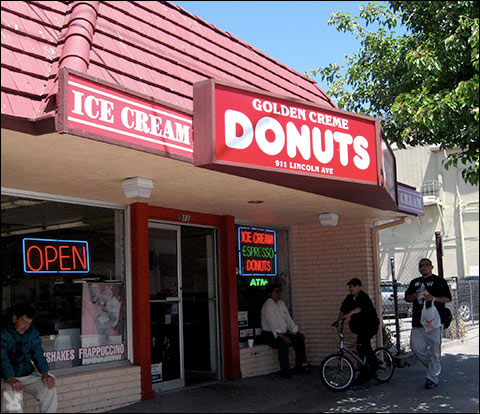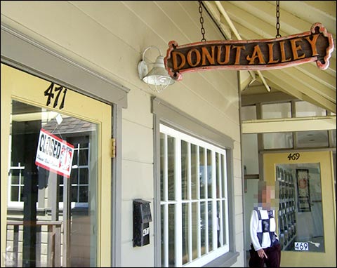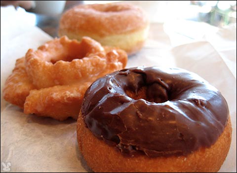 ... with a shrugging woman behind the windows mouthing, "sold out" (which seemed like a loophole for shuttering at 11 a.m.) We aborted the back alley visit (since they wouldn't feedus) and went to another vendor of hole grain food. Most people think of chow mein and sushi as Asian cooking, but it seems to me that donuts are frequently fabricated by first generation fry-masters of the Far East.