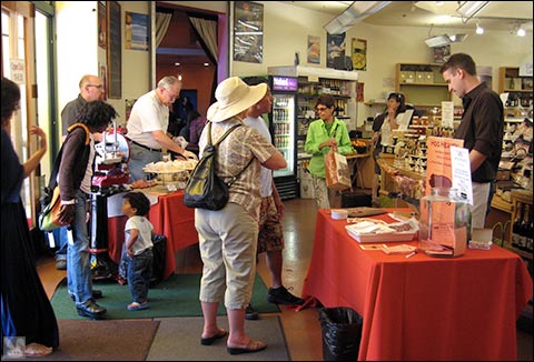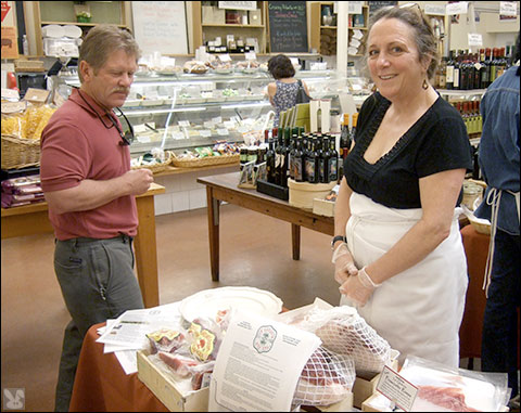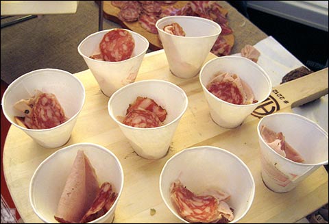 ... which took place this afternoon at the Pasta Shop in Berkeley. Thin slices were whittled off for salivating seekers of sensational saline satiation. The flyer had the feel of a larger event but we cone-soled ourselves with a couple of Boccalone's: