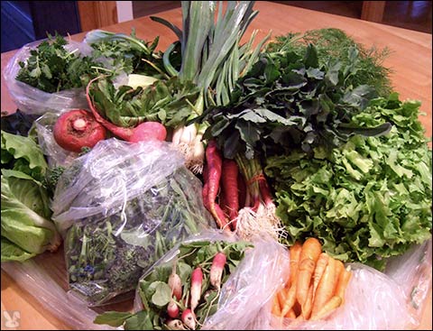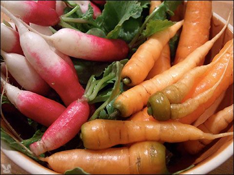 Thursday, March 6, 2008 permalink The best deal in town We used to have a subscription for a weekly organic produce delivery. It would arrive at our hutch bursting with fresh and delicious chow, there was only one problem I had with it - it ran my life. The only thing I hate more than wasting food is wasting top quality food and I would let this organic monkey on my back restrict our dining out habits so that I could use the stuff up. I would also neglect my updatable list and wind up with enough potatoes to power all the clocks in the Northern Hemisphere (provided that they were all potato powered.) What I like about the Mariquita Farm setup is that you choose to participate without a subscription commitment. We emailed our order for their $25 “mystery box”: ... on Tuesday and came to the Slow Club (which acted as this evenings designated meet up point) to pick up our organic veggies: ... consisted of generous helpings of broccoli di cicco, spigariello, green garlic, leeks, nettles, puntarelle frastigliata, escarole, radicchio, fennel, Italian parsley, turnips, purple carrots, baby carrots and French breakfast radishes. The carrots and radishes: ... were so fresh that their little hearts were still beating. They got washed and eaten first. This type of purchase is a great way to broaden your veggie horizons. I wouldn’t ordinarily buy a huge bag of nettles, but boy were they delicious tossed in a hot pan with olive oil and finished with some Maldon salt. I cooked up a little sample of most of the greens: ... so that I could get ideas on what cooking method I ultimately want to subject them to later this week. There are also recipes on the Mariquita site in case I need some inspiration. The next pick up date is March 20th at Incanto between 5-7 p.m. A clever move would be to reserve a mystery box and as well as a table. You can tuck your veggies in your car and tuck into one of Incanto’s famous lamb’s necks or a glass of wine at the bar. We were impressed by Mariquita Farmer, Andy Griffin, during last year’s Gastronomy by the Bay. Not only do he and Julia supply some of San Francisco’s best restaurants with tasty vegetables, he even finds time to do a little blogging of his own. Mariquita sold out of their boxes this evening, so it’s important to put in an order ahead of time. And you can leave the credit card at home, it’s a cash deal, but it’s the best $25 that we’ve spent in a long time.