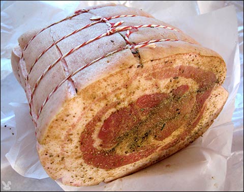 I wanted to cook a whole piglet, but after checking around, I learned that a true suckling pig is not easy to come by. "Suckling pig" is a term that has expanded to mean a small pig beyond the suckling stage. My inquiries were met with offers of small pigs weighing in at over 25 pounds. It turns out that there is little incentive for producers to sell piglets under this weight since their profit can grow sharply in a matter of weeks. Taylor: ... and Toponia of the Fatted Calf checked with their specialty suppliers and found the same reluctance, but they offered a delicious alternative of one of their porchetta. We went with one of these oven-sized rolls which get a coating of olive oil and a sprinkling of fleur de sel before getting bunged in the oven. We had sampled this roast: ... on an earlier visit to their shop when Toponia was passing porcine pieces to pleased punters so we knew what swine dining lay ahead. We decided that as long as we were at the Oxbow Market we could duck around to the farmers' market area for some veggies and salad makings, but I guess it's an idea best reserved for the weekend. The only produce vendor had bananas, pineapples, coconuts and mangoes. That farmer must have a long drive back to tend their crops. There is a seafood market and a Ritual Coffee Roasters under construction in the market hall and of course all those hotels that will surround the Oxbow Market, so this area will eventually qualify as a zoo (sans suckling pigs.)