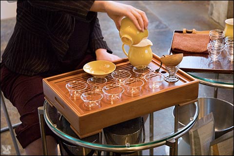 Before the tea ball started rolling on leafily infused chocolates, we couldn't fathom this multi-fermented formation. Now that this confection has made it down oolong the steep hill to become a Darjeeling in the valley of our chocolate hearts we have sampled many of these pod-ticularly tea-riffic treats, but today we got to have them with coordinating brews: Charles chocolates and Teance Tea's monthly pairing event: ... at Charles chocolate bar is an opportunity to spout off questions about chocolate and tea, while watching candy-making action on the factory floor:
