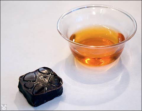 They started us off with a Jasmine infused truffle with a Jasmine white tea: ... but the rest of the chocolates were not from the tea collection. Our favorite combos were the raspberry heart and Anxi Tikuanyin Oolong and the Meyer lemon marzipan with the Ceylon Orange Pekoe: