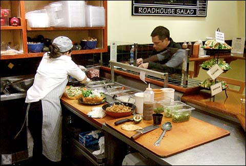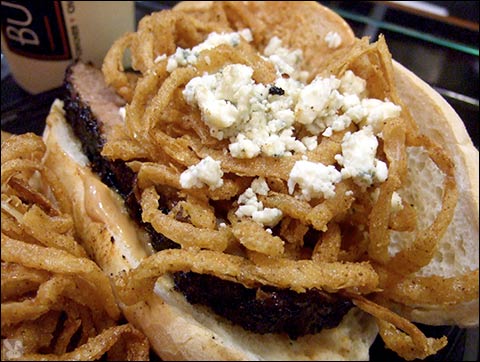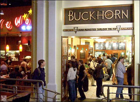Tuesday, May 6, 2008 permalink We got our tickets for the digital screening of Iron Man: ... at the Metreon a scant half hour before show time. Tavern on the Green is not yet a top floor dining option, so after a quick round of food court roulette we wound up at the Buckhorn Grill: ... which I wouldn't describe so much as a restaurant; it's an alternate reality in which oil is cheap and plentiful. I got a Little Buck sandwich combo ($9.20): ... which is a quarter pound of sliced tri-tip with jus, caramelized onions, a drink and some onion rings. It's the sort of meal that makes me feel as though all the water in my system has been replaced by oil. Chubby got the Roadhouse Buck combo ($9.40): ... which has a tri-tip sandwich with blue cheese crumbled over a fistful of those onion rings which are wedged into the roll. The American Heart Association logo must have slid off the menu at this ode to OPEC. To be fair, health freaks don't have to get the meat mit with the o-rings, they also have humongous salads served in a deep fried tostada shells and the friendly staff did get us fed and out the door lickety split. Iron Man would love this place. He could get well oiled and be off to fight crime in minutes.