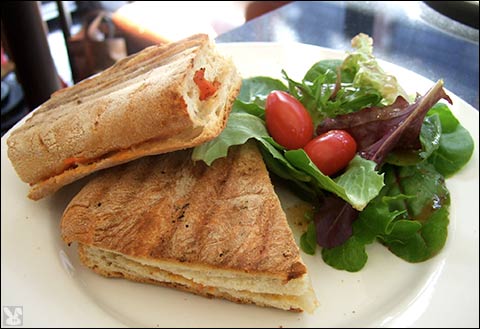 I realize that ordering sandwiches at a patisserie is tantamount to requesting fish in a steakhouse, but in an effort to walk past Starbuck's breadwiches we opted for our repast just down the street at Patisserie Philippe. My chicken tartine ($6.25): ... had a couple slices of herbed, roasted, chicken breast, under some melted Mozzarella with slices of tomato on this open faced sandwich served with a simple side salad. Chubby got the ham and Swiss panini ($6.25): ... which was encased in a toasted ciabatta shell. Roasted red peppers and onions added some interest to this hot pocket which also came with the same greenery. Our chow was serviceable, but it's really not fair to go into a pastry shop and not order anything which combines butter, flour and sugar. One thing's for sure – we're glad we passed the 'bucks.
