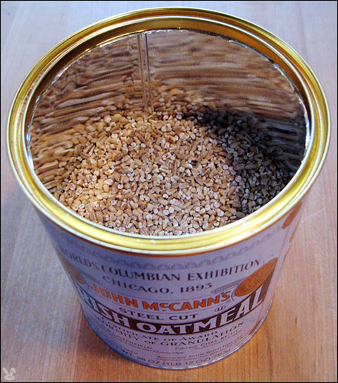 The McCann’sSteel Cut Oats cann has a retroat design: ... that is appropoat since the empty cantainer offers a convenient place to hide your money after a run on your bank. ...when you are holed up on a rainy day.