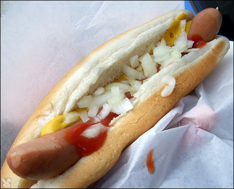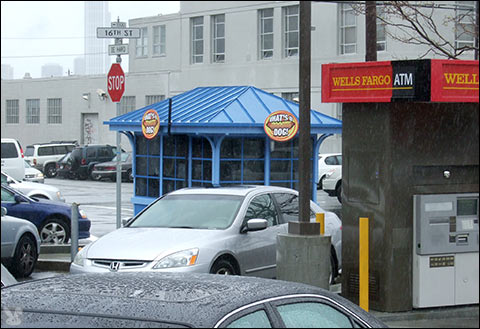 Monday, March 2, 2009 permalink Although my dog ($3.00): ... didn’t have enough snap and spice to distract me from the cats and dogs that were coming down, this wiener from What’s up Dog! was a convenient and welcome frankenfortification. This chain of tube traders are tucked into some of the busier snacking hubs of the city. They have wisely equipped this cylinder-firing station with an on-site ATM robust enough to accommodate the needs of Kobayashi or Crazy Legs if they happen by.