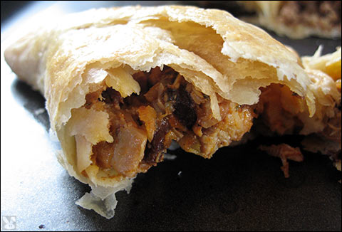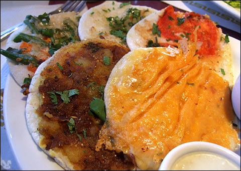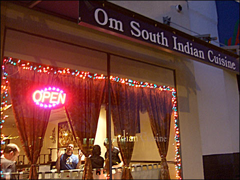 We had no dilemma in making our om-nivorian selection of “cocktail” uthappam ($9.99): ... at Om South Indian Cuisine: These mini sour south Indian flapjacks had an assortment of toppings including cheese, potato, tomato, onion, beans and peas. Chutneys and a chickpea curry condimented these hot cakes. We both preferred the tang and sweetness of tomato chutney over the mild coconut version. We had to put the brakes on getting a refill of macaroni wheel-shaped fried rice crackers in order to preserve room for the Kozhi varutha curry ($10.99): Nicely seasoned chunks of chicken didn’t have the “fiery” hotness that the menu indicated, but there was a pleasant accent of heat in this coconut milk bathed, homey dish. Om is always a good chants encounter with a business that displays good mantra-tization skills. The service may not be as well lubricated as the dosa pan, but this casual eatery is a good stop for a cheap and cheerful bite.
