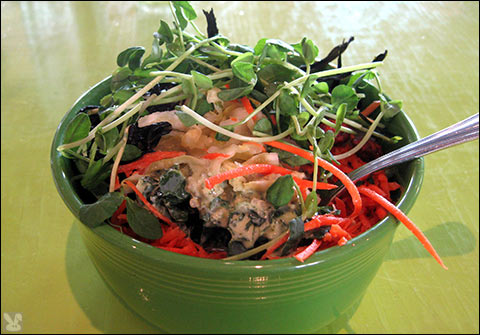“You are whole” announced the arrival of my dish. He would have added “an ass” if he picked up on my thinly veiled negativity. There are bottles of water on the table with glasses (where I presume you are supposed to mix the Kool-Aid.) I took a few small sips to to insure that any drug effects would introduce themselves slowly enough for me to make a break for the door. When I didn’t wake up in Arizona donning a earthtone robe in a drum circle, I deemed it safe. My Purina Hippie Chow had a nice flavorful boost from the tangy pickled cabbage, and kale in a garlic tahini dressing with textural interest from the contrasts of soft quinoa, crunchy soy flavored almonds, julienned carrots, sprouts (shocking!) and seaweed. I actually enjoyed every bite of this flavorful health food until I reached the bottom of my bowl which read, “what are you grateful for?. What am I grateful for? Agendas that aren’t hidden under my food. This is an excellent place to take Senator Al Franken or people who would be happy to describe themselves as spiritual, but the Stepford/Bohemian service program macromakes me bristle. It has been a couple of years since my last visit and despite my discomfort with their newage system, I appreciate the culinary diversity that this chain holds in the Bay Area (even for a contrarian vegetarian) and I’ll endure more of their freaky treatment until I wake up in Arizona.