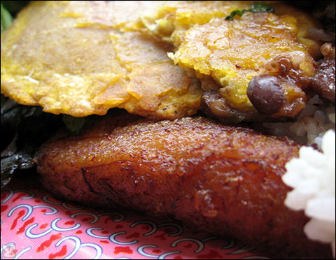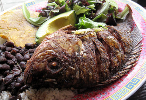 There was a line out the door and every seat was taken during lunch at Sol Food today. I came for the Friday special of Tilapia ($12.95): After a showering my whole fried fish with hot sauce, I pulled apart the moist bits and chewy skin, dragging them through a pool of the house made vinegary pepper sauce and lime. My counter neighbors nudged each other worriedly when I gouged out and devoured all the edible bits from its roly poly head but hey, hedonism trumps forks. A garlic-laced salad, plantains, ripe avocado, black beans and rice filled out my fishy feast. One of our cyberhutch visitors clued us into the possibility of selecting half tostones and half maduros as a plantain option: Although both the smashed garlic and the 3D whole bananas are good - side by side, I preferred the sluggy version for its soft, sweetness. The most common mistake I see is diners who don’t hit the sauce. It’s not what I would call seriously caliente and it adds spark to the chow. They even sell it by the bottle for off-site use. Sol Food is worth a stop even if you miss fish fry day.