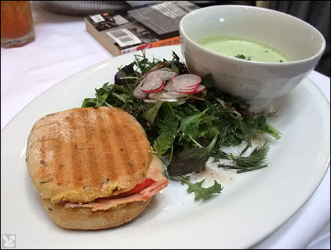 My soup was a cool cucumber with yogurt and dill at Elan Bistro. This refreshing eye-cover, eye opener appeared to be a herald of good chow, but sadly, the ham and Gruyere sandwich that came with this combo ($14.75):