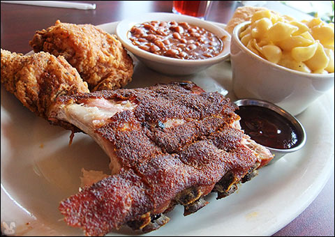 Although the chicken was fried to a moist-centered crispy-edged doneness and the baby back ribs weren't tough, the focus wasn't on seasoning. I'm wondering if the under-seasoning is an intentional act to compensate for their heavy helpings (by making a low sodium health claim) or perhaps it is to accommodate a clientele that demands milder chow.