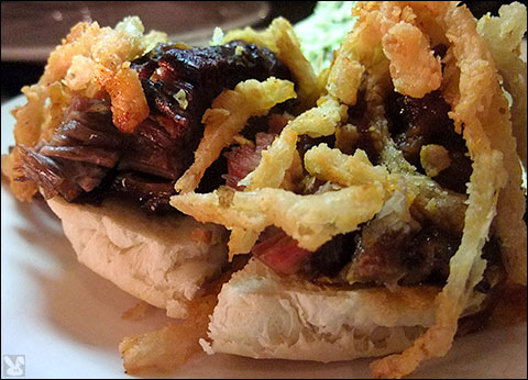 ... resting on an open faced sandwich at BarBersQ. The last time we brisketed here, the meat was pleasantly fatty and didn't require moisture meddling, (so it’s possible that we just got a bum steer today.) Although not a reorder, we also appreciated the scattering of fried onions and crunchy slaw that cole-ided with this beefy bun.
