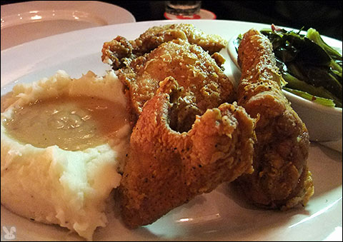 ... was more our thing. This generous serving of moist, free-range fowl was nicely seasoned with crispy bits of coating shielding flavorful meat. Pepper vinegar was a nice counterpoint to this FC. Collard greens buttoned down with hammy hunks and mashed potatoes with a pool of creamy gravy nested nicely with this poul-treat