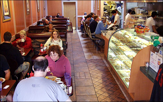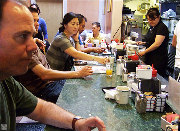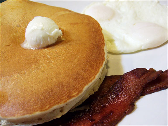 ... cracked two eggs simultaneously in one hand and swooped them into a sizzling pan for my over easies. Thick slices of bacon were smoky strips of succulence flapped beside jacks that came with sad, simulated maple mimicry but my "#2 Delight Special" ($7.50):