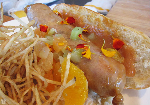 ... was dotted with citrus, compressed cukes and compressed cantaloupe. This pork pole with fruity de mer came on a bun spread with stone fruit mustarda. A haystack of fried potato strings and house made ketchup completed this out of the ballpark doggie detour.