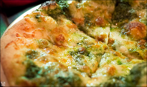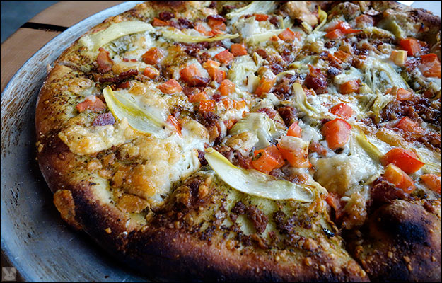 ... with sausage, pepperoni, peppers, mushrooms and pepperocini while pesto, bacon and artichoke ($12.00):