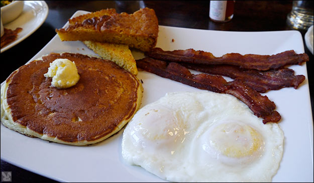 ... with crisp bacon, a fluffy pancake and some toasted jalapeño cornbread and a veggie scramble ($9.50):